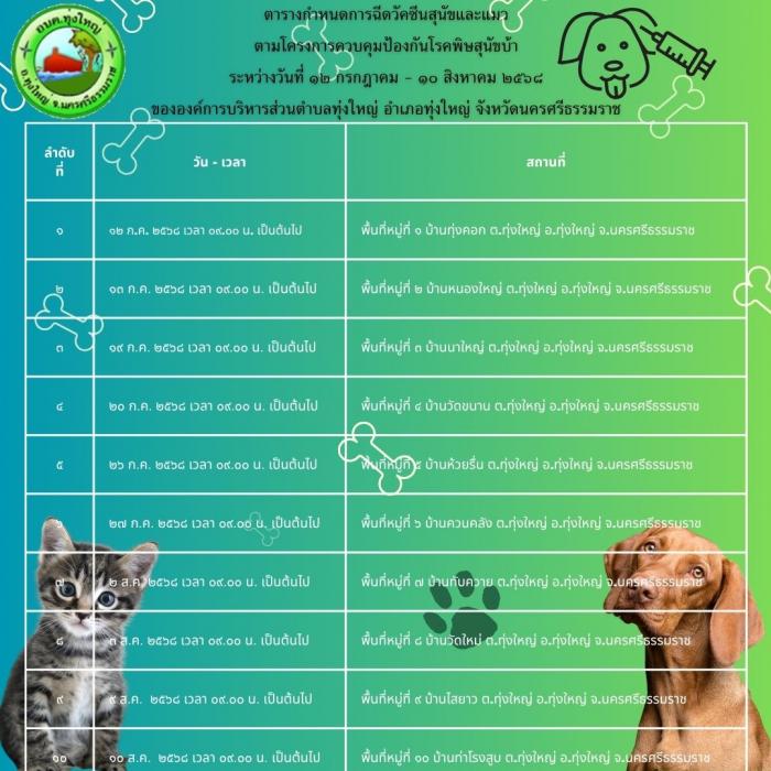 **และหากท่านใดต้องการรับวัคซีนหรือนำสัตว์เลี้ยงของท่านมาฉีดวัคซีนนอกเหนือจากตามวันเวลาและสถานที่ที่กำหนด ท่านสามารถมารับบริการได้ที่องค์การบริหารส่วนตำบลทุ่งใหญ่ ในวันและเวลาราชการ