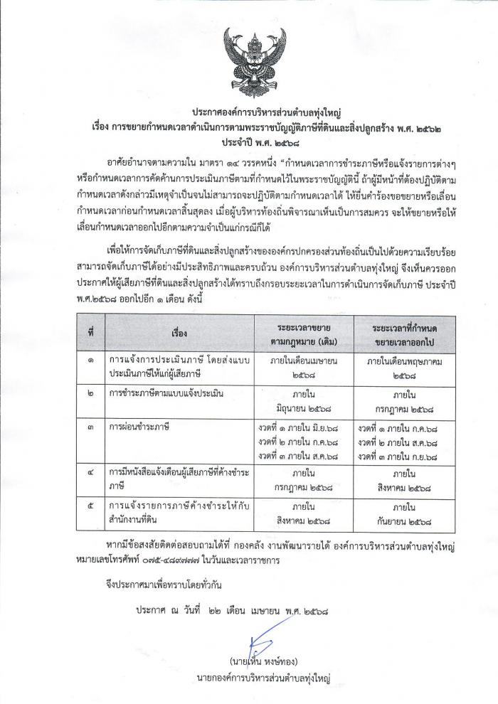 ประกาศองค์การบริหารส่วนตำบลทุ่งใหญ่ เรื่องการขยายกำหนดเวลาดำเนินการพระราชบัญญัติภาษีที่ดินและสิ่งปลูกสร้าง พ.ศ.2568