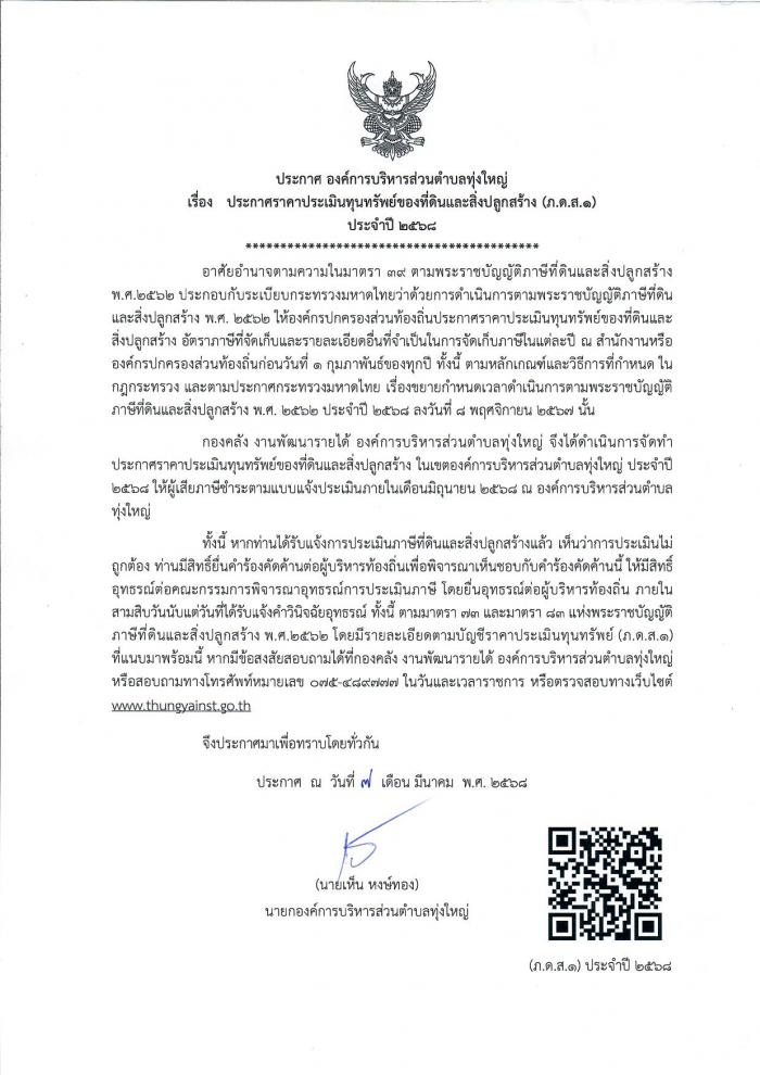 ประชาสัมพันธ์ เรื่อง ประกาศราคาประเมินทุนทรัพย์ของที่ดินและสิ่งปลูกสร้าง (ภ.ด.ส.1)